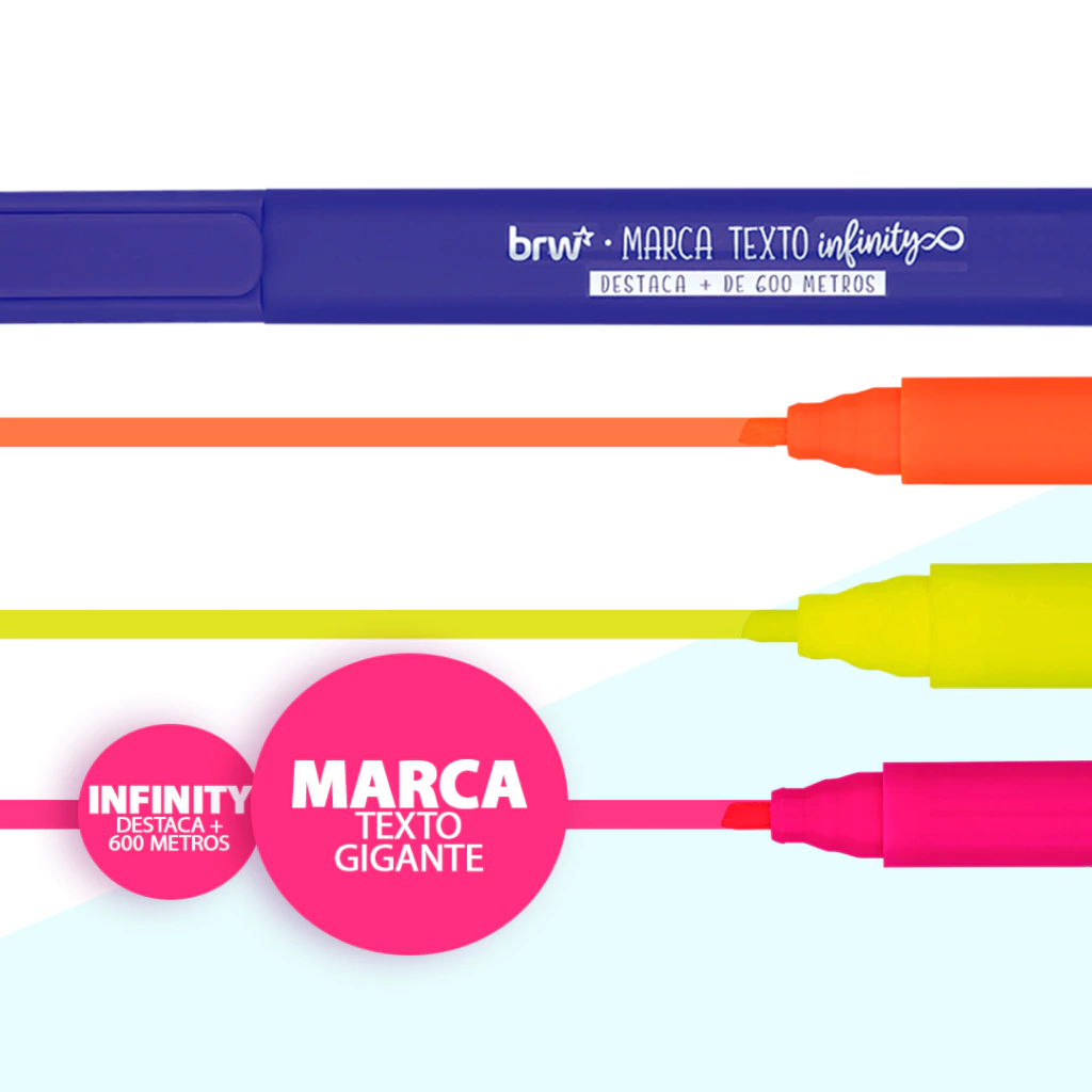O Marca Texto Gigante Infinity é a escolha perfeita para quem busca destacar textos com estilo e muito mais! Disponível em quatro cores vibrantes – roxo, laranja, rosa e amarelo – cada unidade vem com um cheirinho especial que torna sua experiência de uso ainda mais agradável.